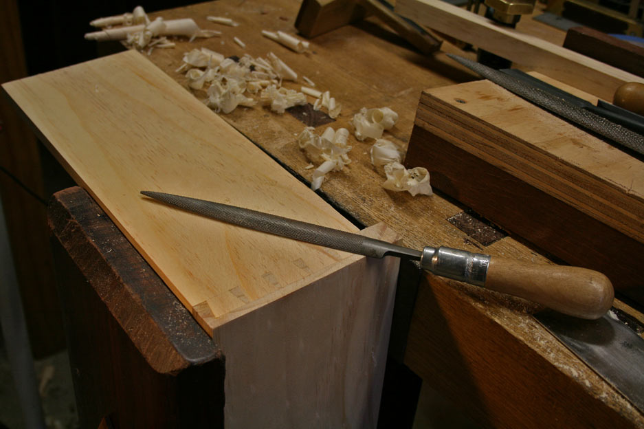 Above: to fit the drawers, they need to be coped to the carcase. This requires removing waste along the drawer sides. A rasp does the drawer front and a block plane takes down the sides. On the real drawers, the sides will be in Tasmanian Oak, which is a hardwood. This will enable the use of scrapers.