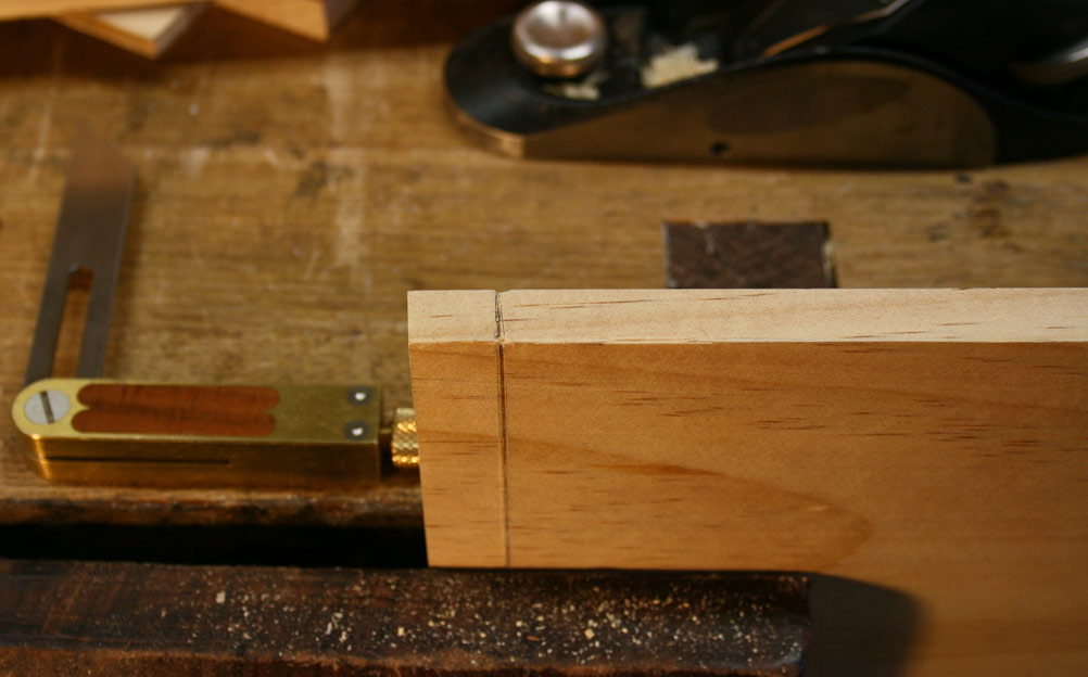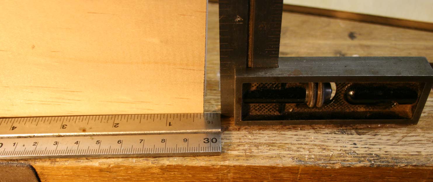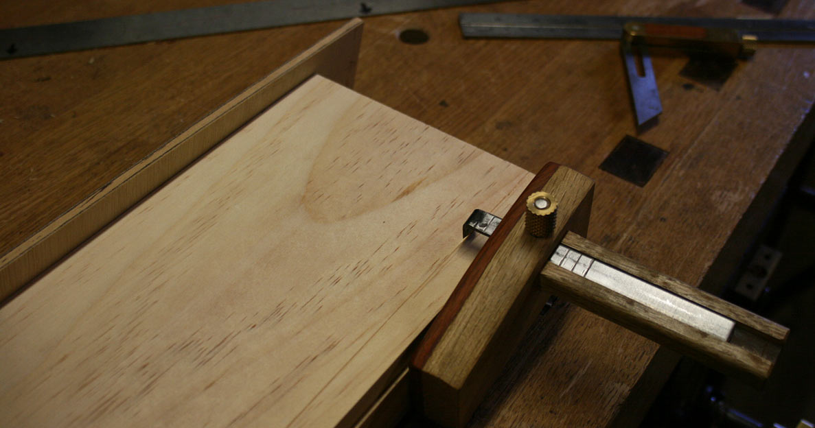 Planning the dovetails takes into account the drawer lip. I am using the cutting gauge on the left, but I included the wheel gauge to show it as alternative. The gauges here do all the marking. It may be apparent now – if you were not aware of this before – that all marking is done without use of scales or rules.
