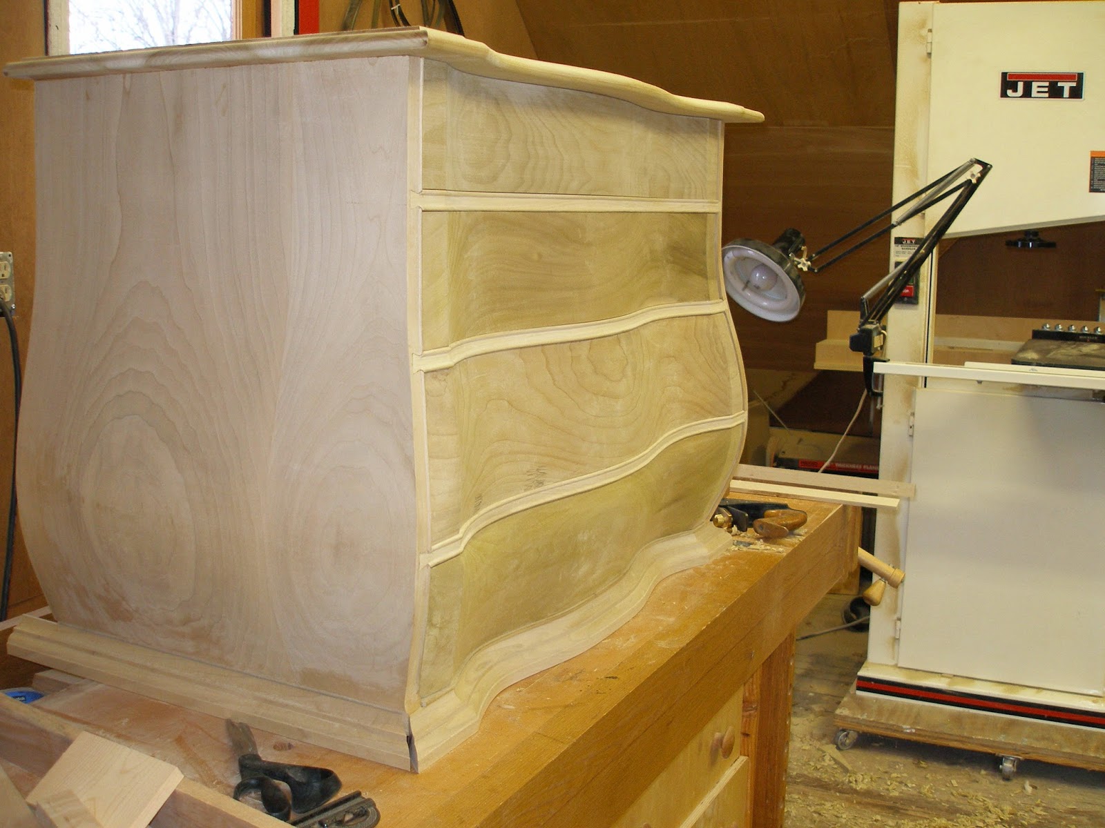 I have found very few examples of drawer construction for coped drawers in bombe cabinets. One build was that of David Boeff. He has built a few bombe cabinets, and does very nice work. His website is worth a visit.