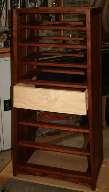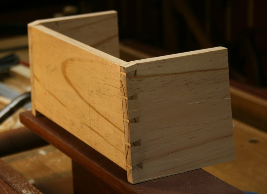 Here’s where the drawers start to get tricky. With a bow, the drawer sides are dovetailed into the curved front at a slight angle. It is no longer square.