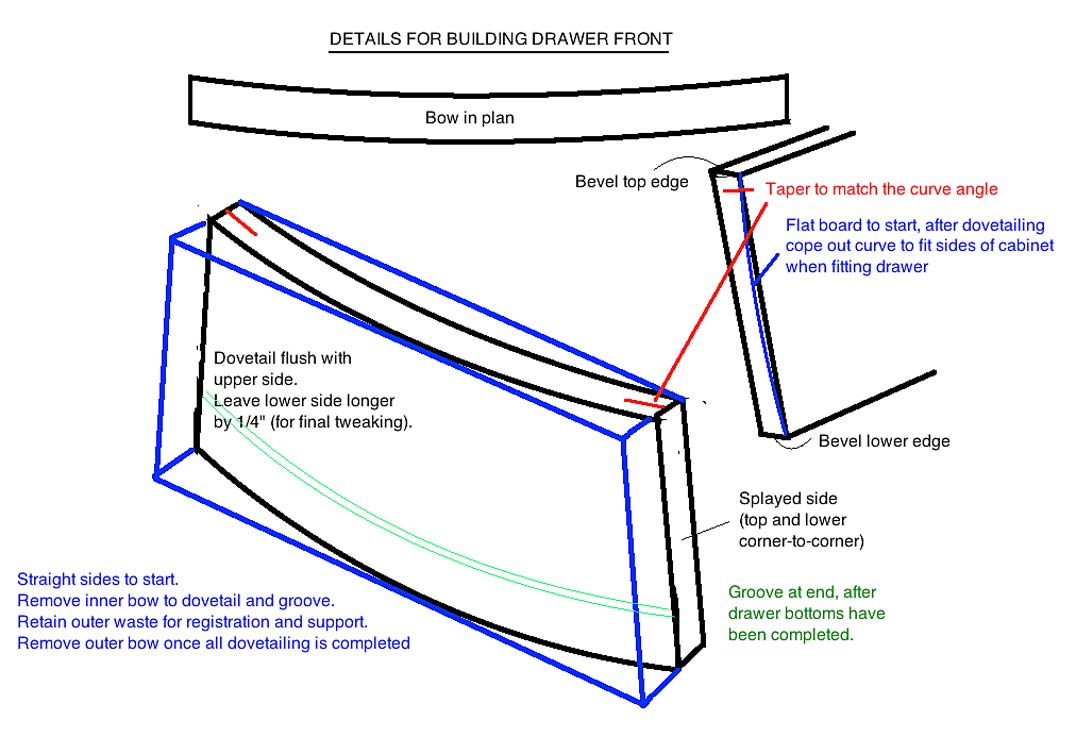 I have been researching bombe and bow-front cabinets for construction ideas. There are two main methods that I can find: either one builds rectangular drawers and adds guides to run them inside curved carcase walls, or one copes the drawer into the side of the curved walls, which is the plan here.