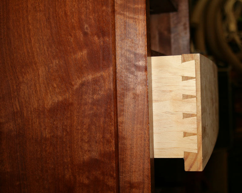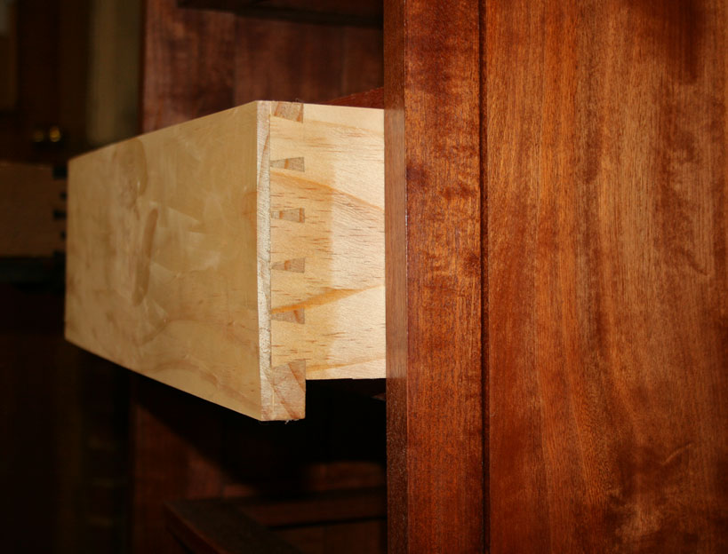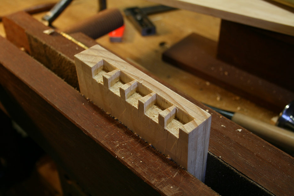 The construction design that David uses is to build thick drawer sides (1”) and then carve them out to fit the carcase …