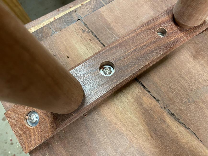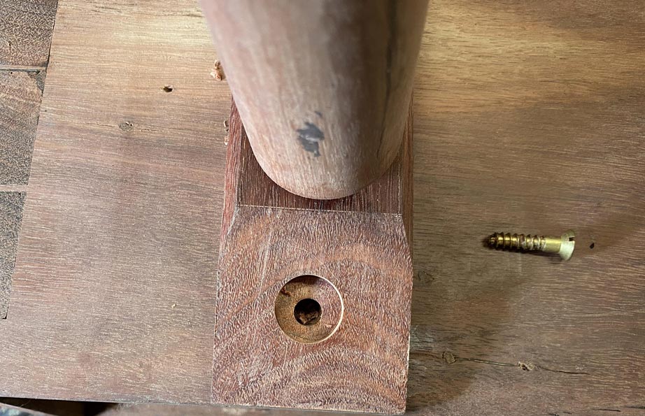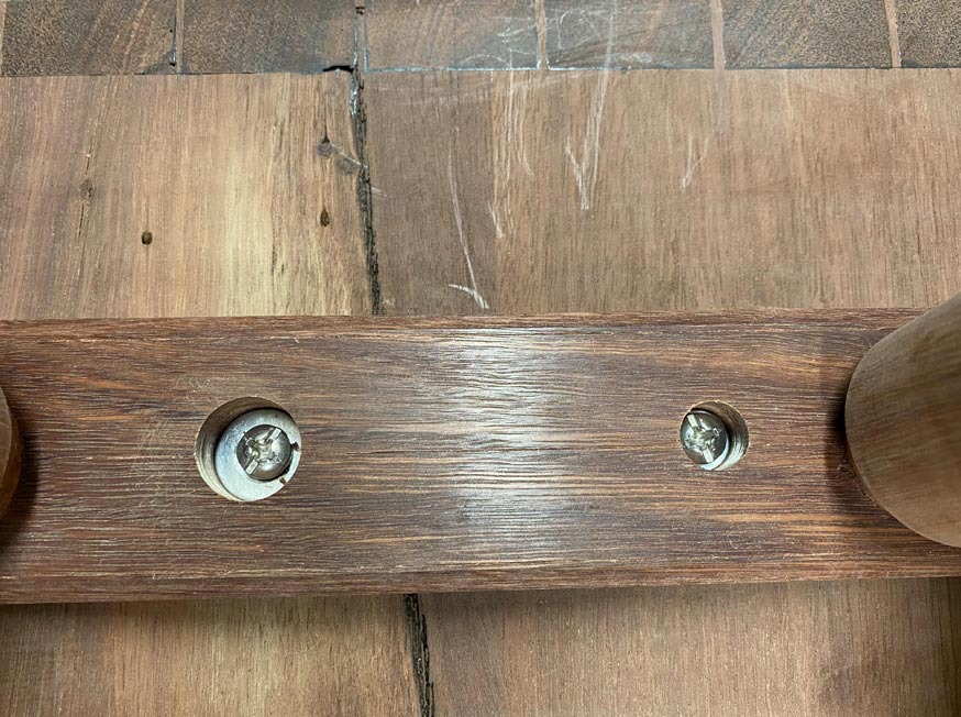 The second screw is on the other side of the leg. This is positioned about half way between the end screw and the glued toe.