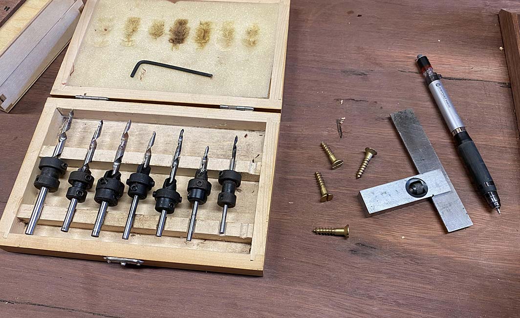 The screws are 1" long brass tapered wood screws. The drill bits are also tapered to match. These ones include a countersink and depth stop.