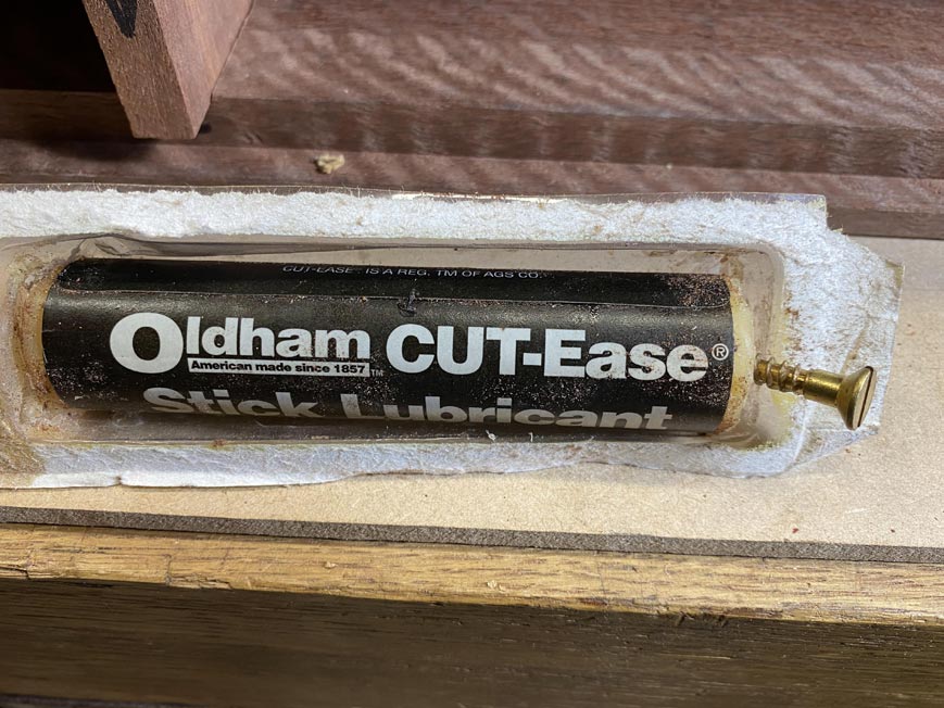 Before inserting a screw, especially brass screws, they are dipped in a little wax. This is wax for lubricating bandsaw blades ...
