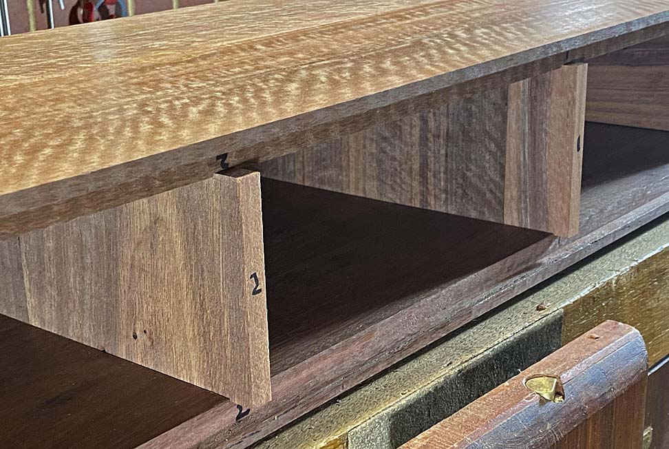 The first was that the grain for the drawer dividers runs the wrong way. Although the boards are as close to quarter grain as possible, which adds to stability, they will expand vertically. That could cause them to buckle, and then the drawers will not run nicely.