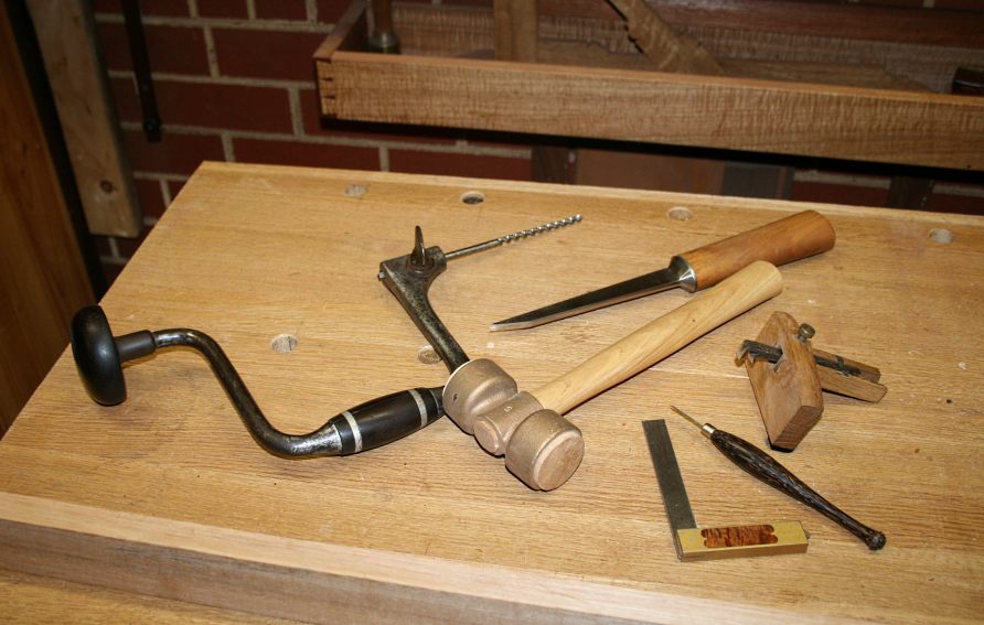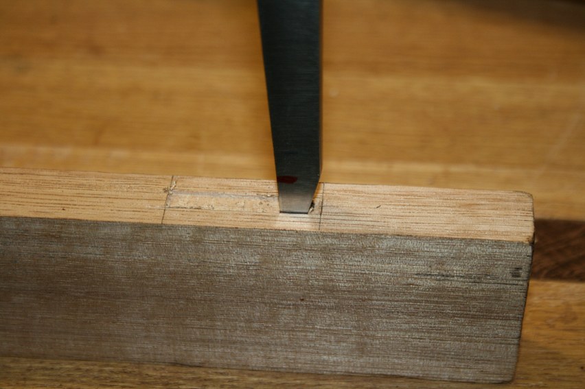 These are the tools I used. ¼” oval bolstered mortice chisel, mallet, mortice gauge, marking knife, and small square.