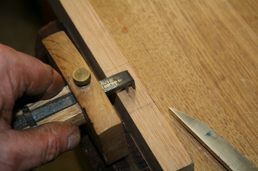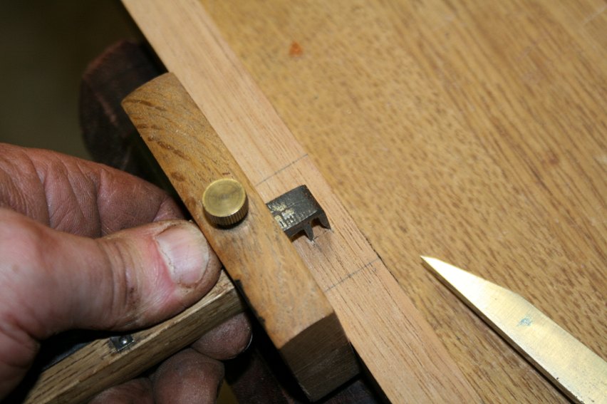 Insert the ends of the blades at the outer edges of the chisel mark, and then slide the body against the reference side of the stretcher. (Set aside the gauge to later mark the tenons).
