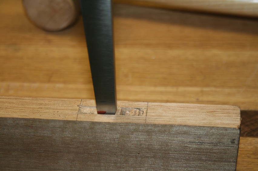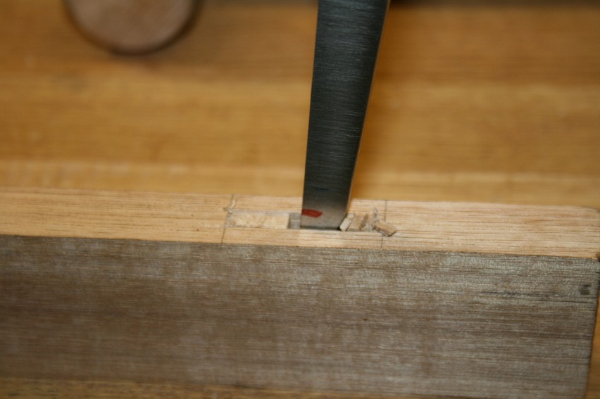 Once drilled, I pare away about 1/16”. This is to make it easier to chisel within the lines. This is optional. You may prefer to simply chop inside the marked lines.