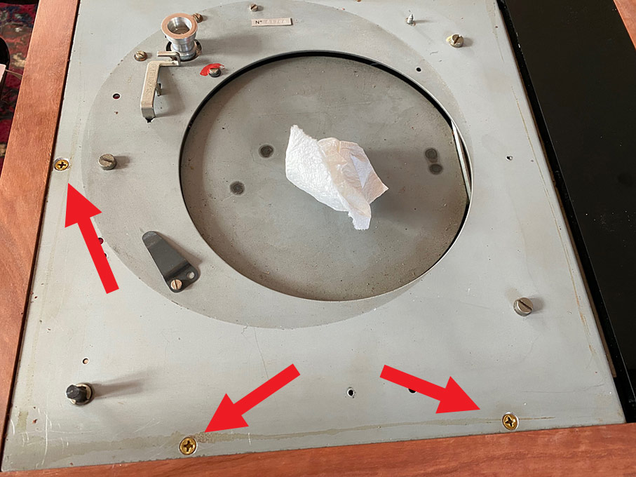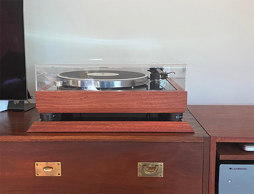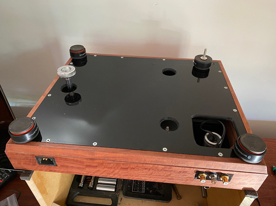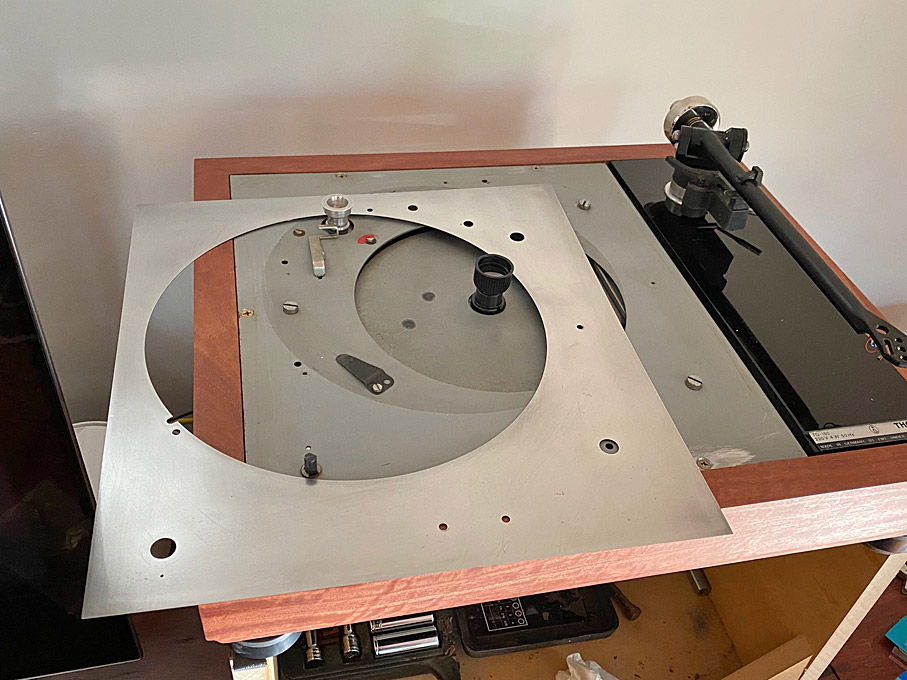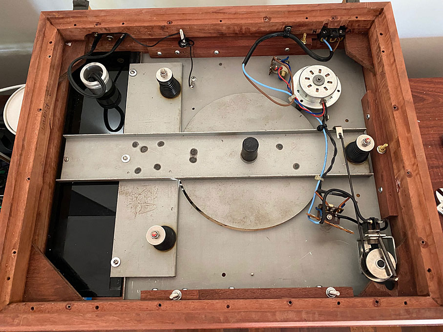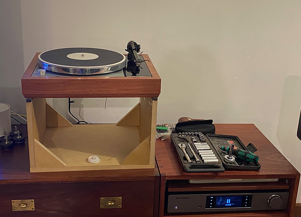 For those who are (incredible as this sounds) uninformed about the construction of this venerable lady, the plinth is about 1/4" thick veneered MDF, with an even thinner hardboard base, and all this resolutely - or should that be resonantly - stands on tiny rubber stubs for feet. An absolutely brilliant design (the suspended chassis, that is) with inadequate clothing.