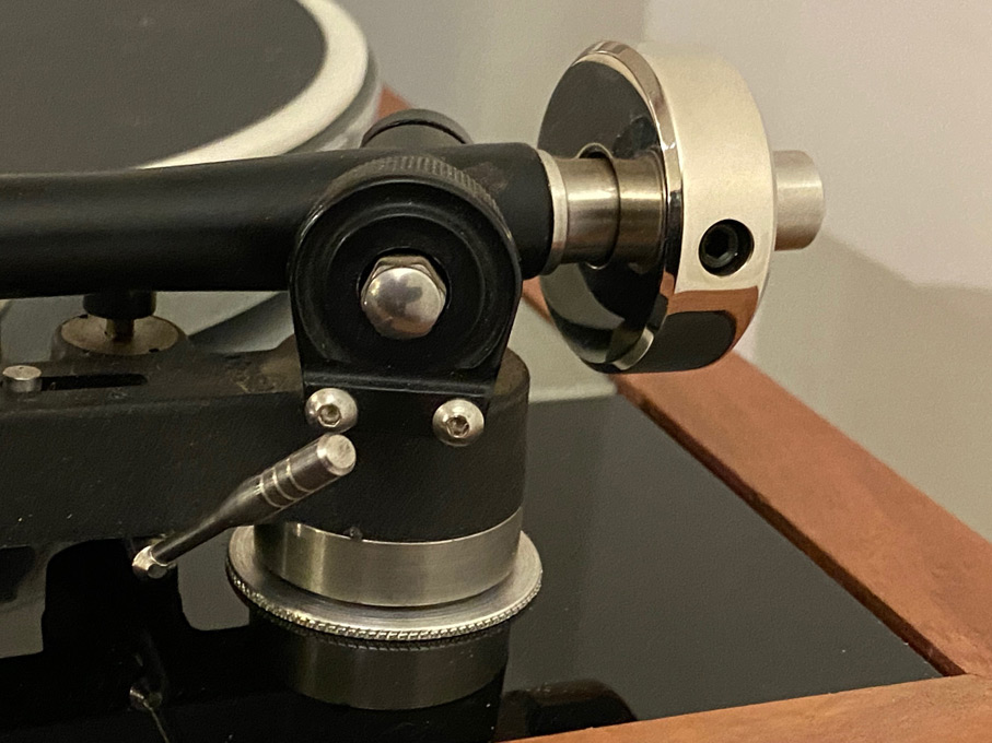 One other addition, seen here, is the Michell Engineering finger locknut for the Rega arm base. This makes it easier to adjust the arm attachment. The original connection was via a large nut, which require a spanner.