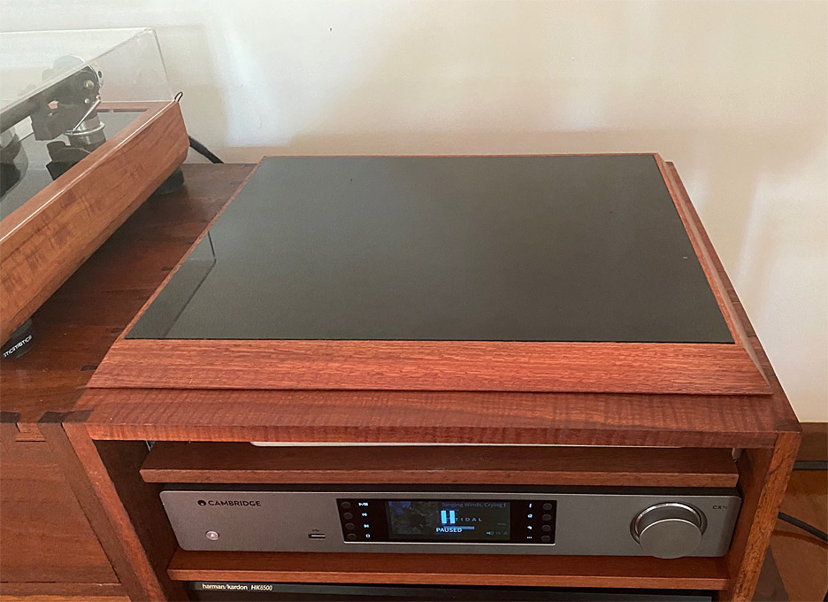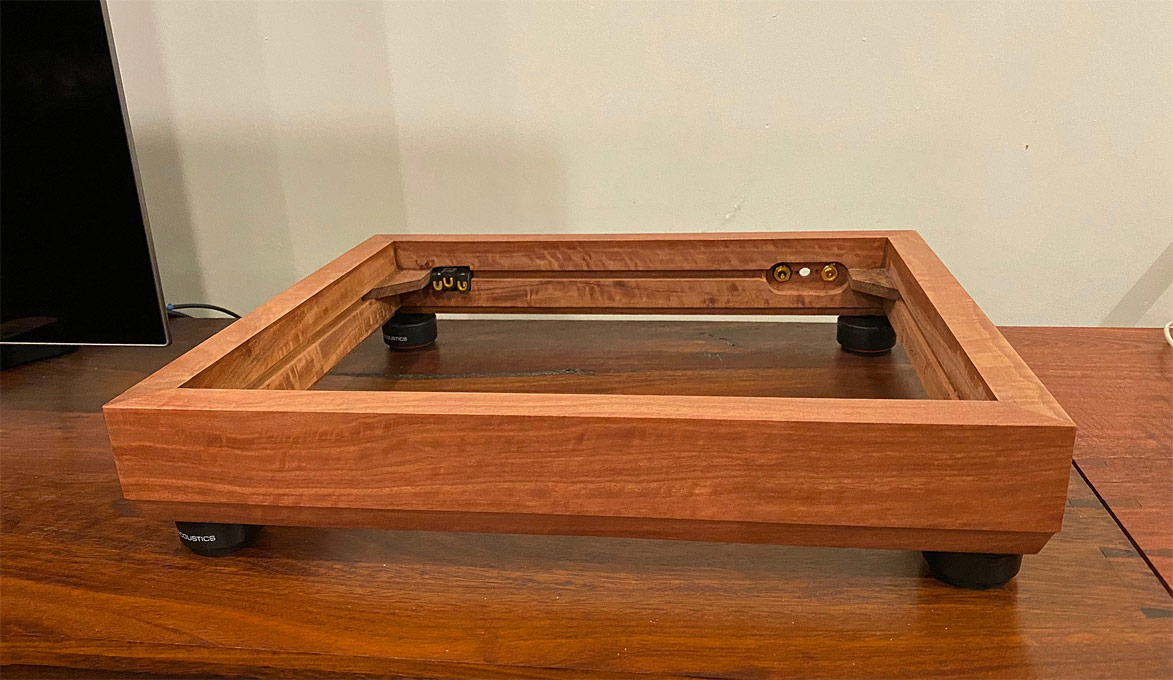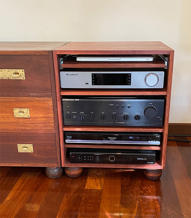 Construction of the stand is Jarrah, with a through dovetailed case. The shelves float on pins to decouple any vibration.
