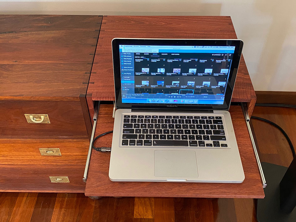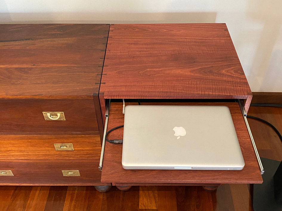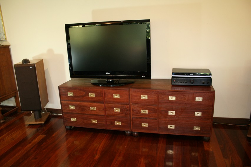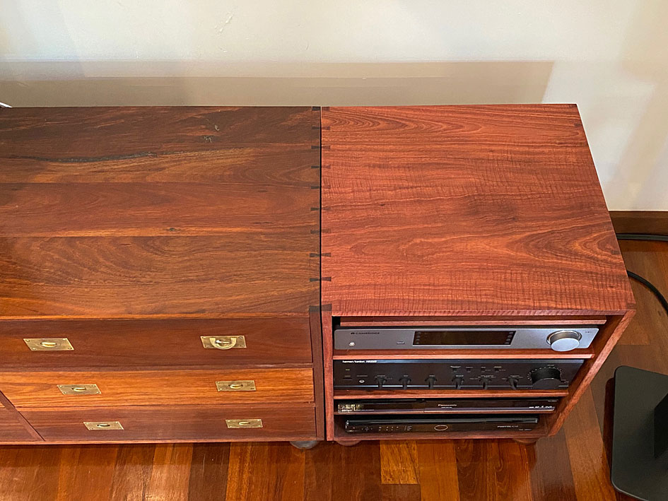In 2010, I built an entertainment centre based on twin campaign chests. The idea was to leave space for the hifi, like this …