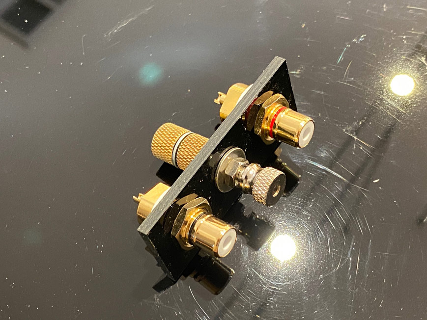 When wiring up the RCA plugs, I realised that there was not enough finger space to do the soldering. So … the plate I had made (from acrylic) came out, and replaced with RCA which could be attached with a nut from the outside.