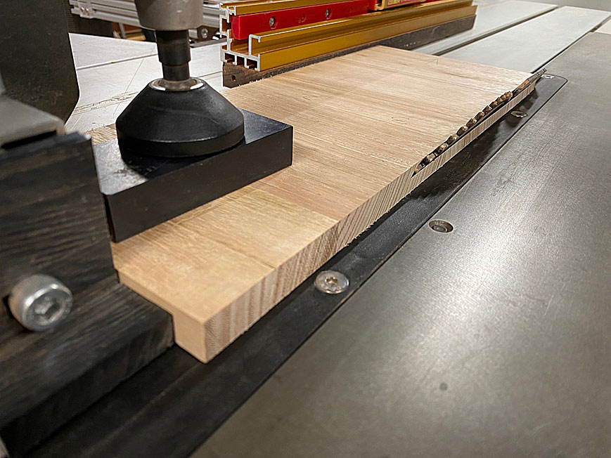 are cut on a sliding tablesaw, a Hammer K3. Here a side is being