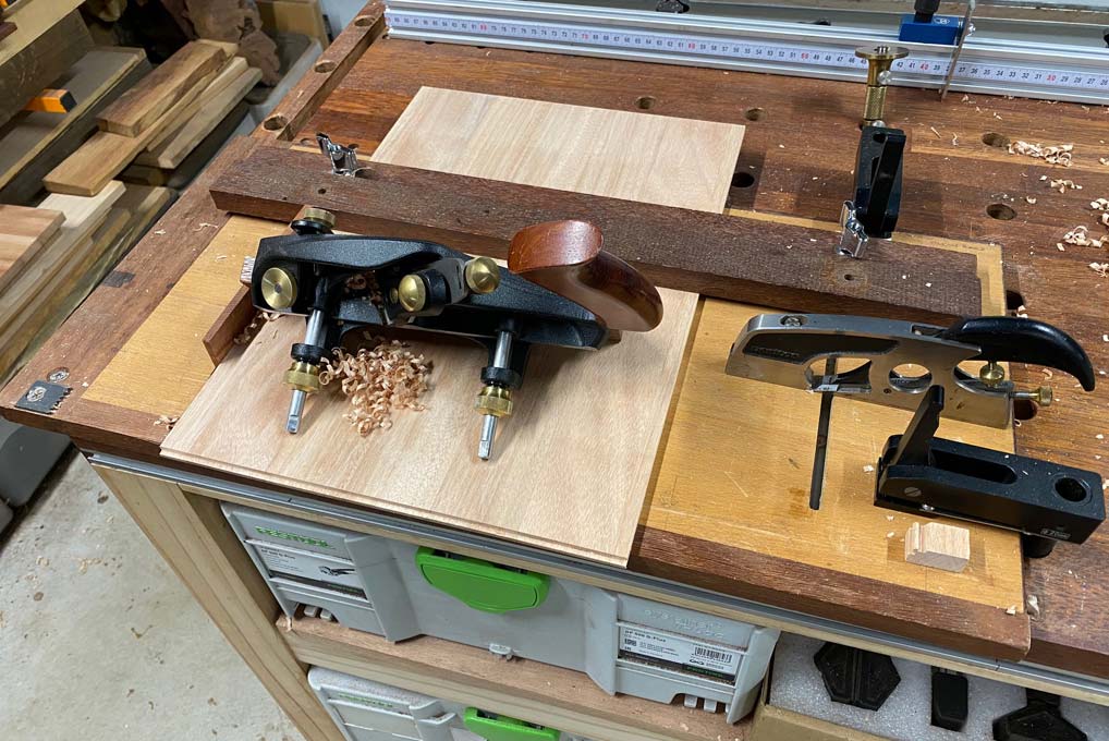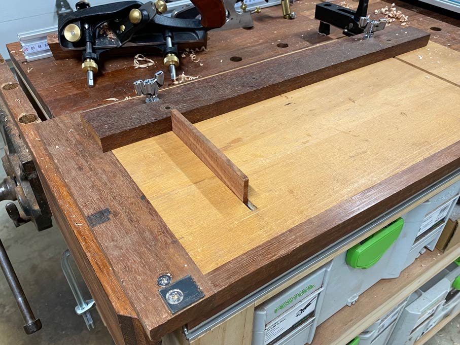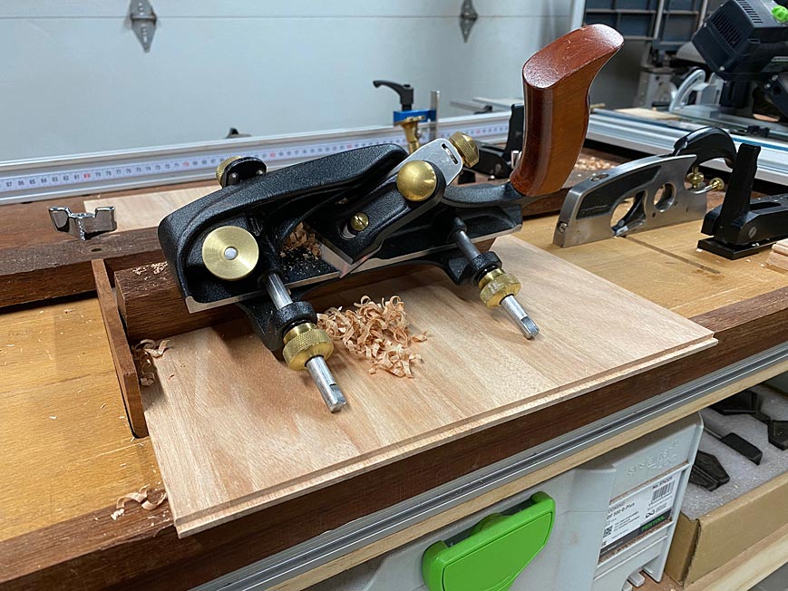 is set on the sticking board to hold when ploughing 3mm side rebates.