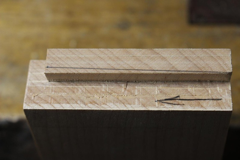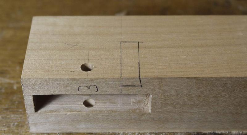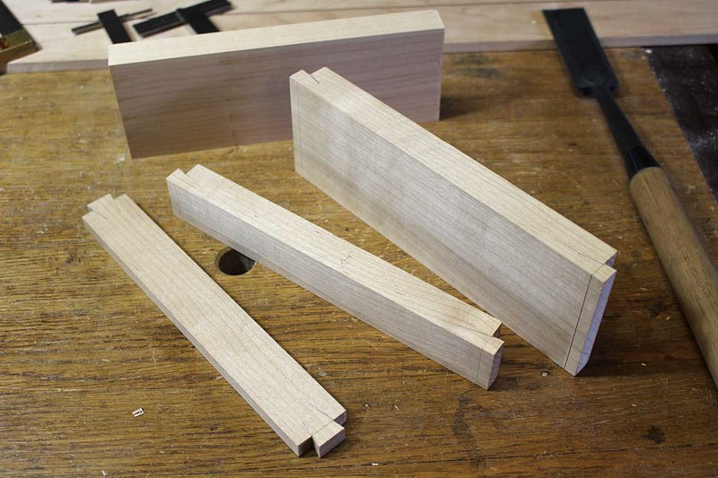 A few hours were first spent aligning the aprons and legs. The legs had been cut from the centre of a board, to obtain the best grain arrangement. As a result, there were no registration sides. A degree here-or-there difference in the legs threw off their alignment. Tweaking them into parallel took some time.