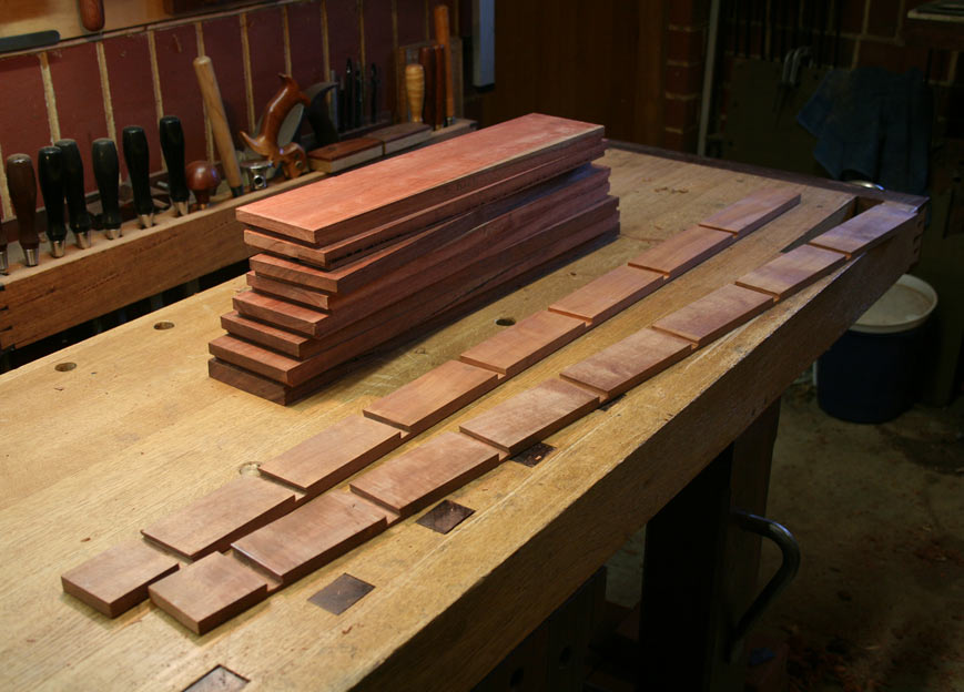 These are all about to be ripped into two sections. The drawer blades are separated into front- and rear blades approximately 48mm wide each. The fillet is separated into a 25mm width for the front leg, and 20mm width to be added to the rear leg.