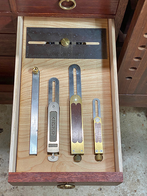 This is a drawer intended to be dedicated to wooden mortice and cutting gauges, but does have two wheel gauges that could not be fitted elsewhere.