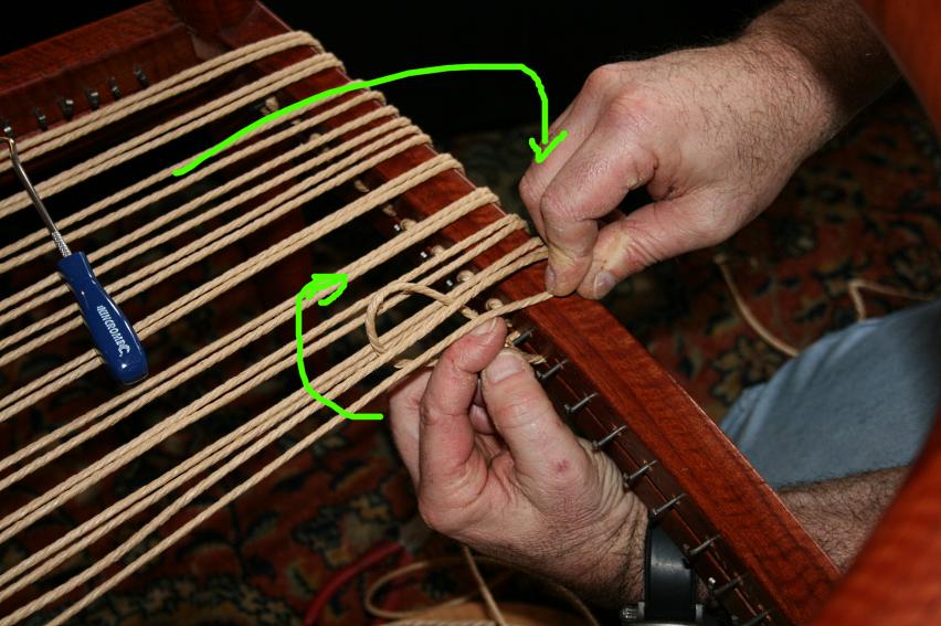 This is possibly the most tedious and mind-numbing activity. Essentially, all one is doing is wrapping the cord around the rail to fill in the space between the weavers.