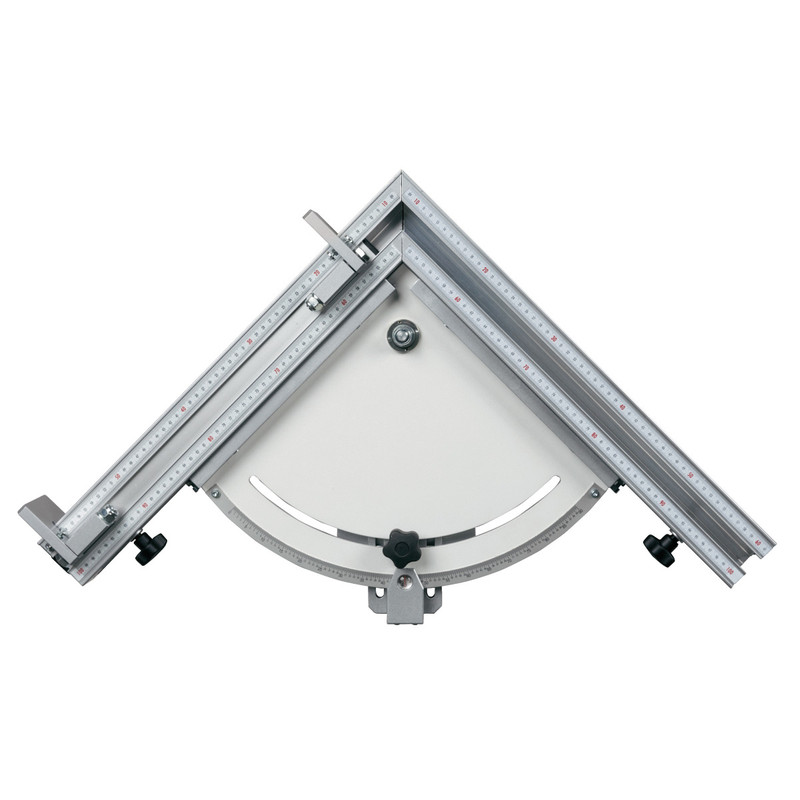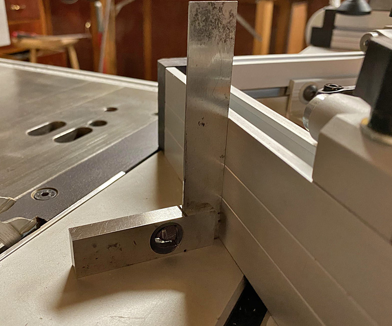 The important … absolutely vitally necessary … build requirement is that it is 90.0 degrees. The left side brackets are fixed, while the right side brackets have a little adjustability built into them (those are the ones with arrows). The right side fence is fine-tuned until it is spot-on.