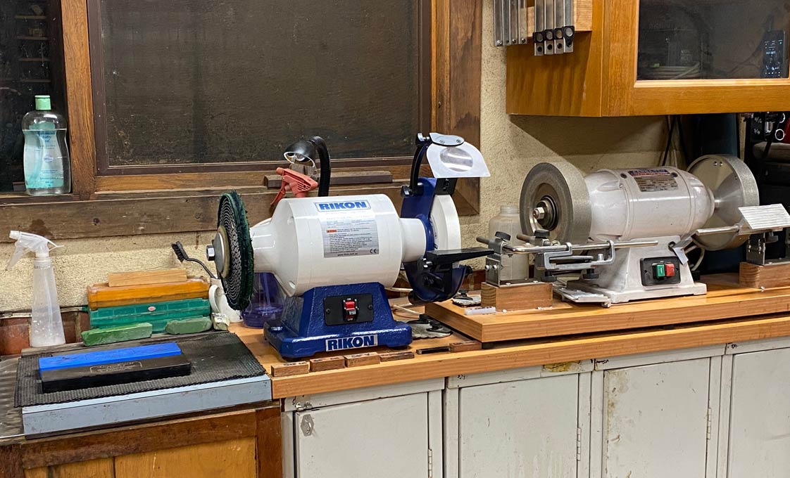 Rikon on the left, now set up with buffing wheels on both sides,