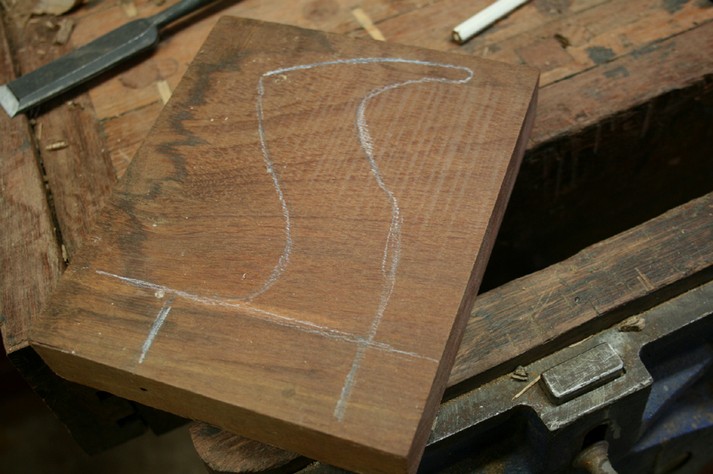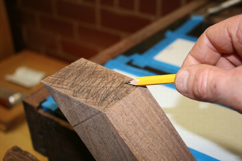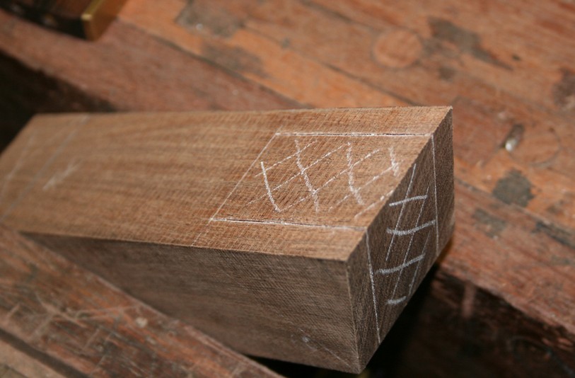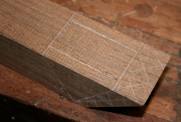 The plan here is to first remove the wood area that that will be taken up by the blade and wedge. This is marked below.
