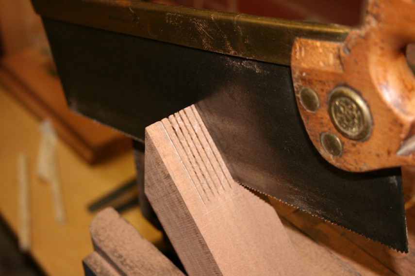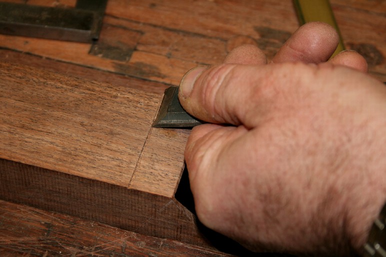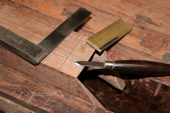 Transfer the depth to the mouth with the cutting gauge, saw to this depth, and then chisel a chamfer to the line. This will aid in preventing any chip out and provide a guide to the depth you need to work to.