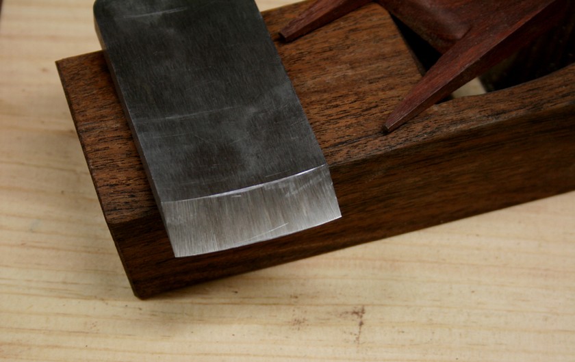 After taking first shavings with this blade, I realised that the camber was too tight for a 2” wide blade. Later it occurred to me that the Stanley #5 ½ was 2 3/8” wide. Consequently I reshaped the camber to a 10” radius. This now took a wider shaving.
