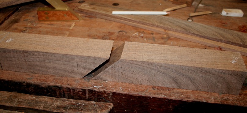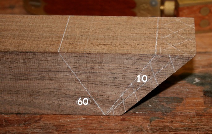 Like the tote, the wedge is Jarrah. This is as wide as the bed. The wedge outline is marked off at 10°, sawn on the bandsaw, and finished by lapping on sandpaper (as done with the bed).