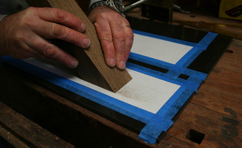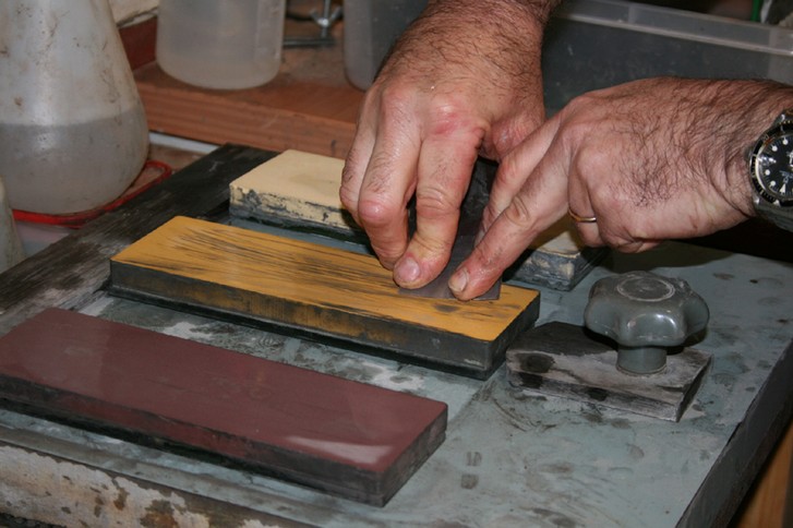 And then 120 grit sandpaper on a granite plate. I pull the piece towards myself.