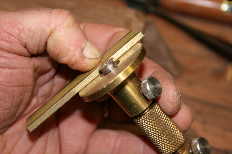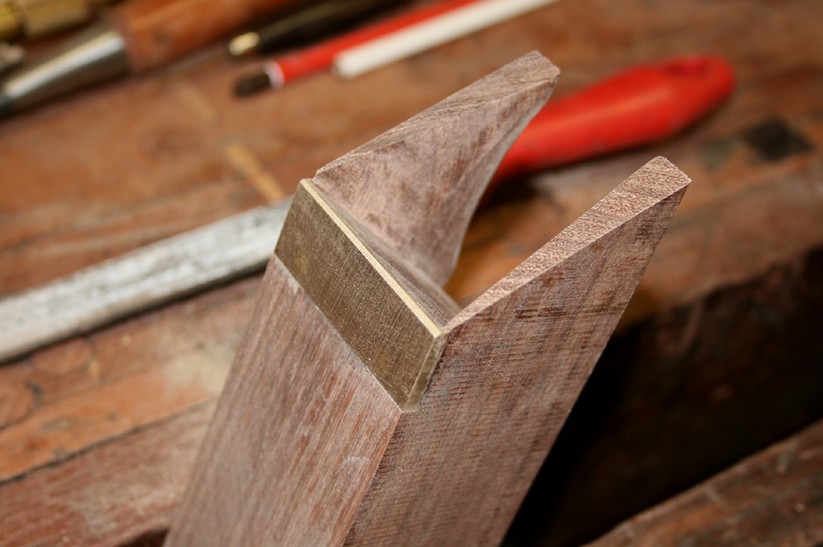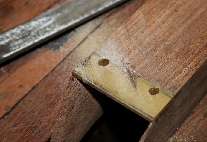 The screw holes are on the edge to use the thicker section of the throat. Here the brass wear plate has been epoxied and screwed down.