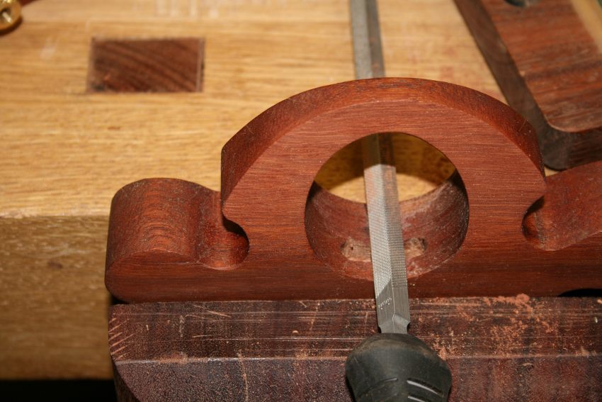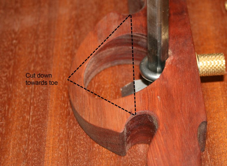 Note that the height at the toe determines where you will be able to place both the hole for the eye bolt as well as the height for its mortice. Since these need to be drilled from the toe side of the plane, the toe must find a compromise height for positioning the mortice and for strength.
