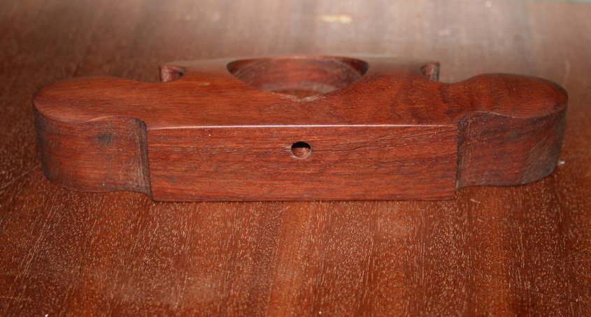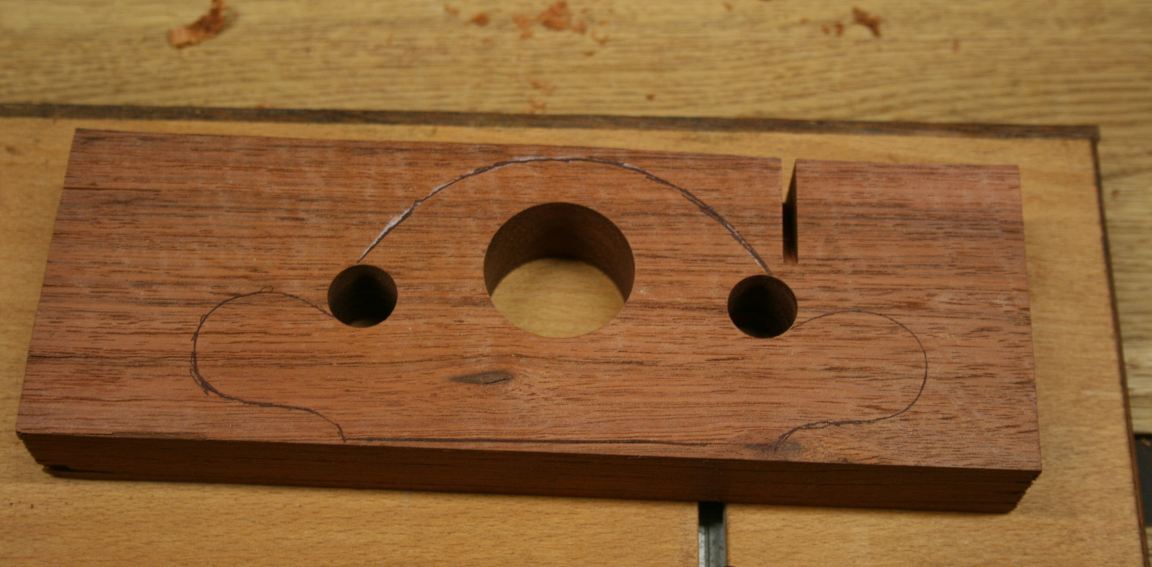 The first step is to transfer the outline of the router onto a suitable block of wood. The grain here is orientated width-wise. Note that the wood used on these router planes is hard and interlocked Jarrah.