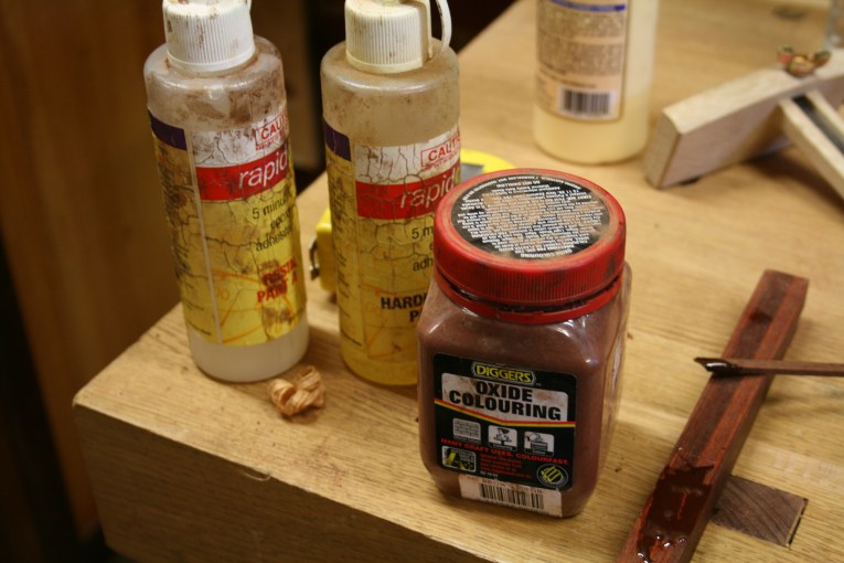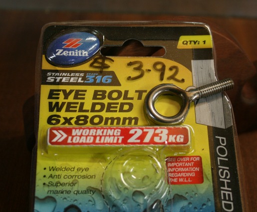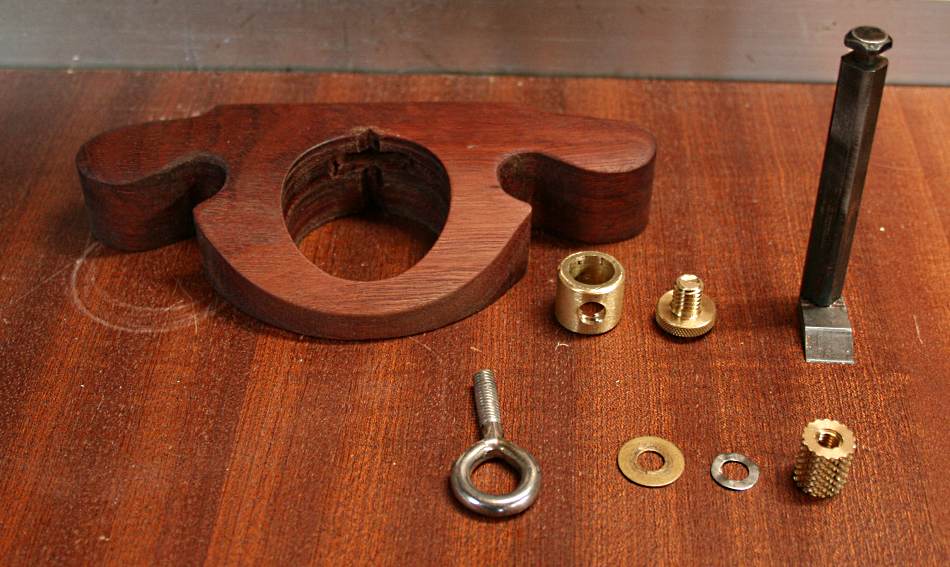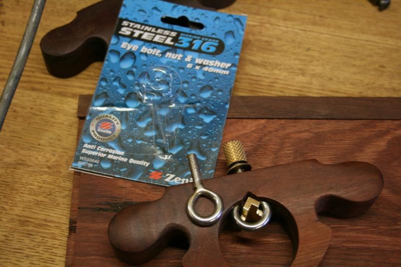 The knurled brass blade adjustment nuts came via eBay (UK), and were referred to as “coupling nuts”. These have a M6 thread, which I had to hunt for. I do not have a metal lathe, so no choice. The eye bolt is stainless steel. This picture is post fettling and cutting to size .. |