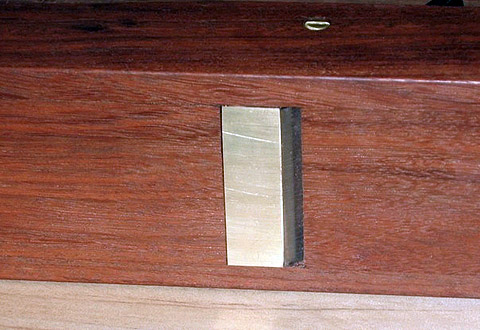 The iron, as anticipated, is a 3/16" Hock that I infilled the slot with brass so that I could use it as a single iron. The bed is 60 degrees. The lever cap is brass, nearly the last of the unusually pink stock I have. This is extremely hard metal. It is polished to direct shavings out of the mouth. The lever cap screw is capped with brass to match. I shaped the side screws out of brass bar.