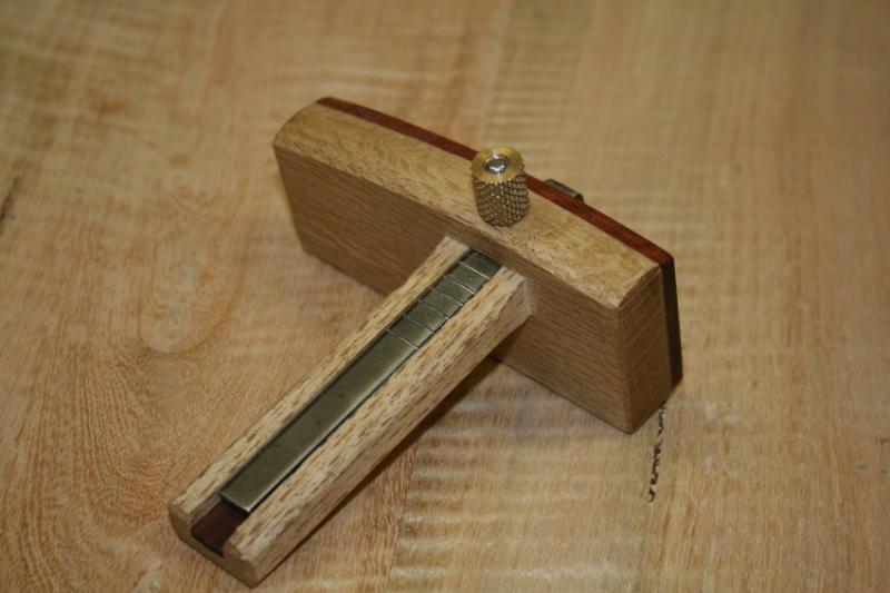 What I particularly like about this style of knife is that setting the gauge for dovetailing is so much easier. To set for an depth that is exactly that of one side, simply place the gauge on top of the board, and drop the knife to the table. Tighten. Done.
