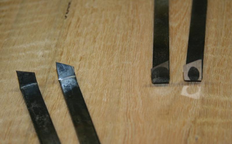 The blades need to be ground and polished on both sides. Two blades enable one to score lines in either direction, that is, with the knife's bevel either towards or from the gauge. The finished blades are on the right side ..