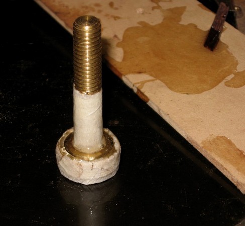 Step 4: Mask off the thread and the knurled ring (it is difficult to later remove epoxy from these), making sure everything is carefully aligned, then pour in the two-part epoxy. The epoxy makes a strong bond. I first made cap screws this way 5 years ago and these are still going strong.
