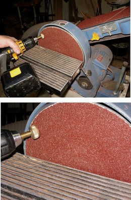 Step 7: … and begin to shape the coin on a disk sander. Spin both the drill and the sander at the same time to maintain an even grind. Dunk frequently in water as the coin will heat up – too hot and the epoxy will melt!