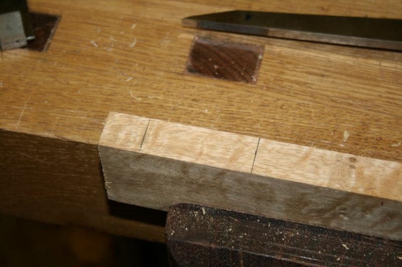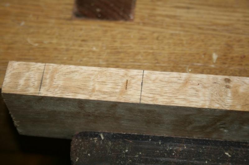 Marking out for a 3/4" wide stretcher calls for a 1/4" wide mortice. This one will be 2" long.