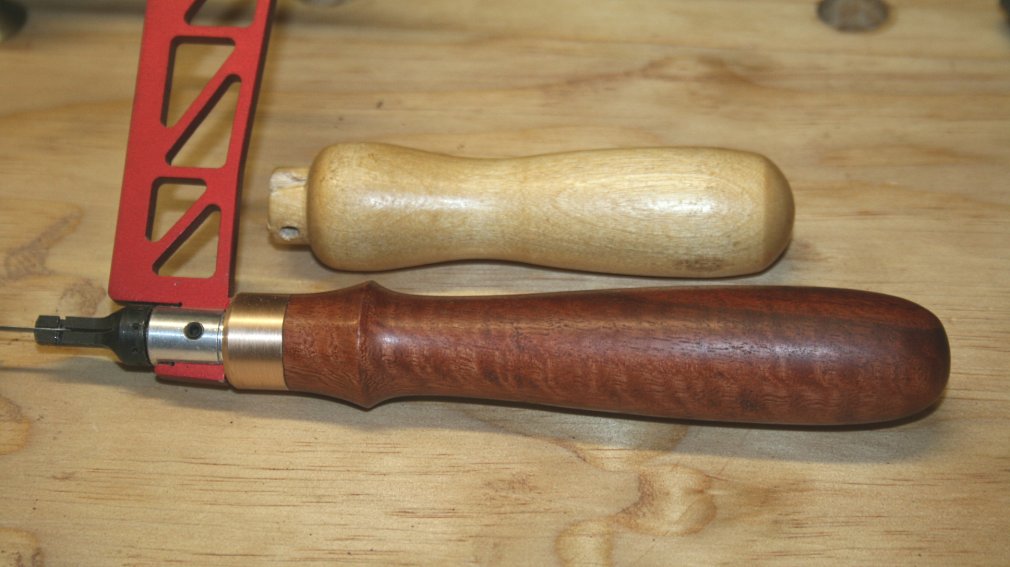 In a review of the Birdcage version of the KC fretsaw I mentioned my preference for a handle that was longer than the original. Here you can see the KC handles alongside one I made ...