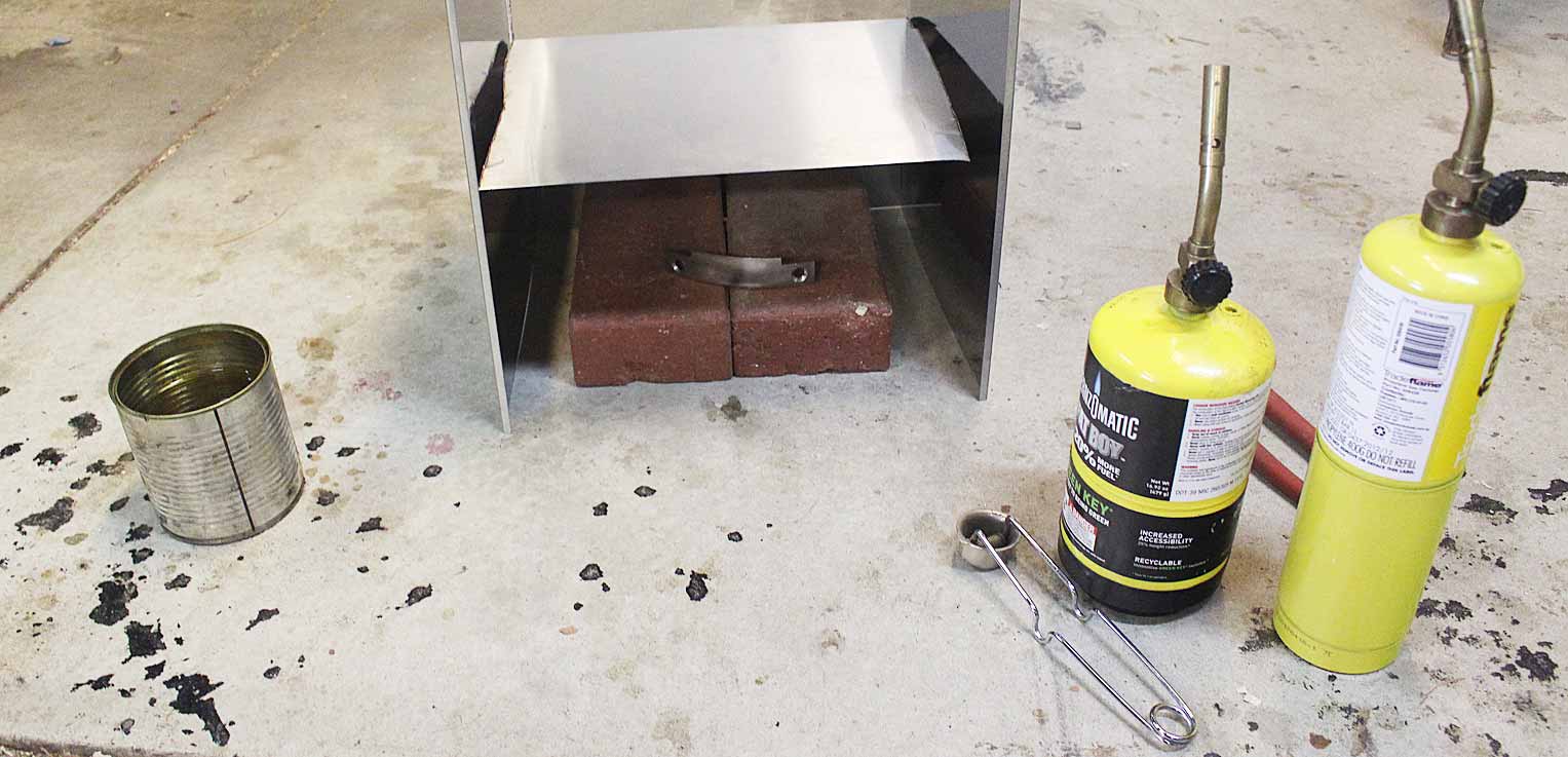 I heated the blade in a “gas oven” I built (a grand name for a sheet of stainless steel and a couple of bricks) …