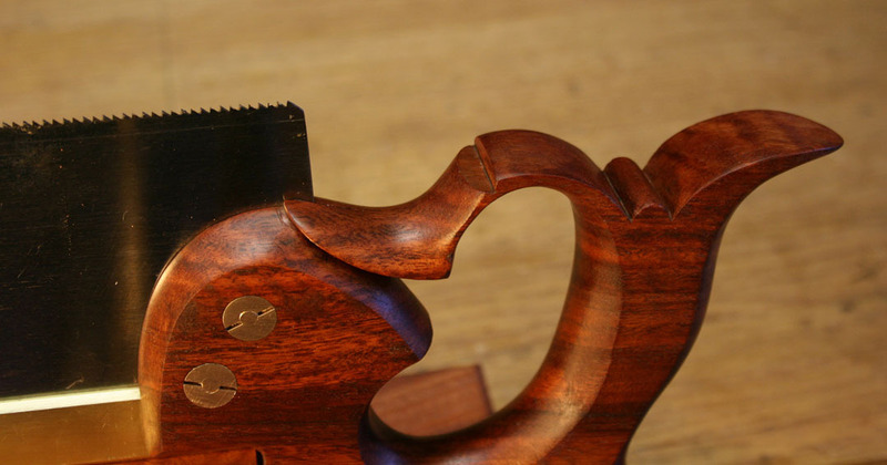 The saw handle was inspired by a Grove tenon saw handle made by George Wilson, whom I consider to be one of the finest craftsmen around, whether tools or musical instruments. George built the saws for Colonial Williamsburg. Here are two of his saws, a dovetail and the tenon saw in question ...