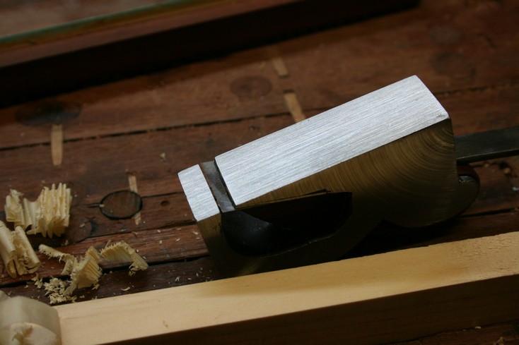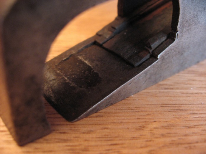 The sole was slightly cambered, and this was flattened on my belt sander. This also gave me the opportunity to square the sole relative to the bed (i.e. remove one side of the sole until the iron exited the mouth evenly … of course it helps if you have an iron that has been prepared to its final format, so get this done first.