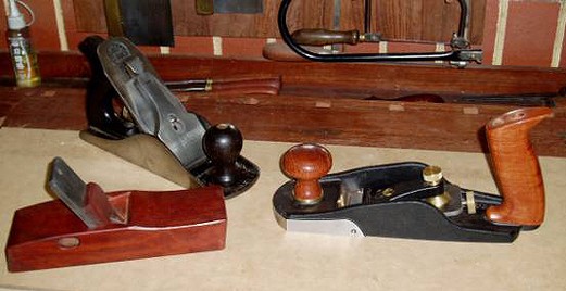 My workbench is moderately high - 35 ½ “ - compared to those of Frank Klausz at 33” (since Frank is 6’0” tall, this bench is clearly very low) and Ian Kirby at 34” (he is 5’9”, about an inch shorter than myself). (information available from The Workbench Book by Scott Landis). It was built many years ago and before I thought to dedicate it to handtool use. It occurred to me that the smaller and lighter planes (such as the LA Smoother) require more down force, and that the thinner totes permit me a tighter grip to control them. Perhaps higher benches are better suited to planes that require less downforce?