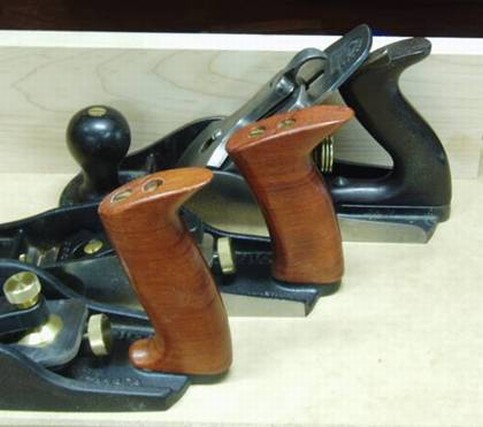 The second factor is the angle of the tote (according to my protractor, approximately 80° for the LV and 50° for the Stanley). The angles of the LAS and BUS are the same, but significantly more upright (vertical) than the Stanley. What is the effect of this? Once again it appeared to me that the Stanley tote was designed for a different bench height (and a different era of handplaning) than the LV. More downforce may have been applied to the Stanley because benches were lower. By contrast, the natural orientation of the LV seems to be that of forward, that is, in the horizontal, and this seems to be better suited to taller benches (modern benches designed for both hand- and power tools?).