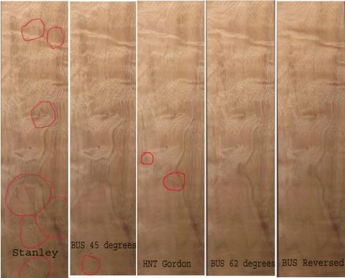 Again the Stanley is poorest, followed more closely this time by the BUS-45. The difference in the results achieved most likely reflects in part the input of the higher cutting angles of the HNT Gordon (second best performance) and BUS-62 (best performance).