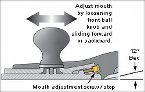 With the BUS you slide the adjustable mouth forward (to guard against the blade edge striking a metal surface), place the blade on the plane’s bed between the set screws, replace the lever cap, return the sliding mouth to its preset position, then fine-tune the blade for square and projection.