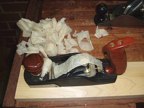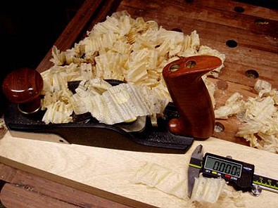 While the quality of the planed surface is really the measure of how well the total smoother package is working, one of the popular tests is how thin are the shavings. A reasonably thin shaving is .002” thick, with .001” being the product of a well-tuned smoother.